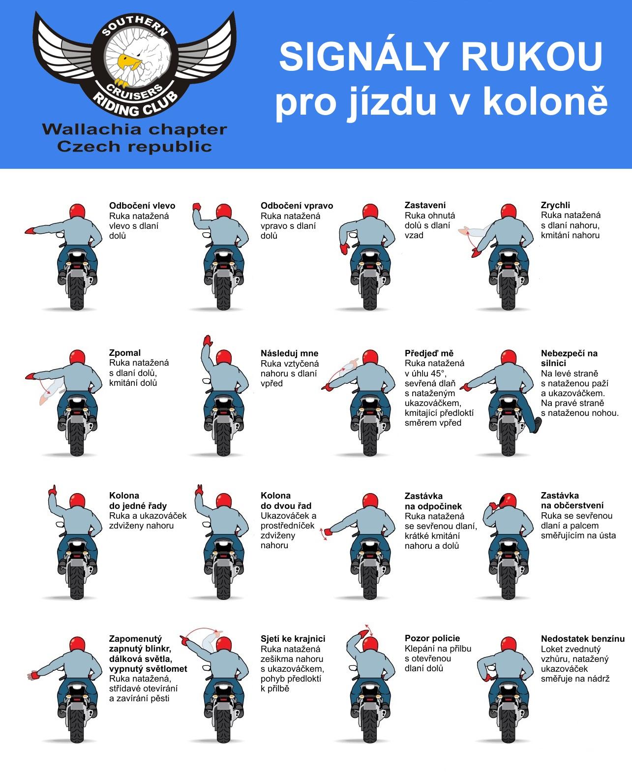 Každá z našich chapter nebo jiných klubů má trochu odlišný názor na četnost používání těchto signálů. V každém případě byste se měli přízpůsobit pravidlům vedoucího kolony. V opačném případě jeďte mimo kolonu a nenarušujte zažité zvyky jejich členů.
